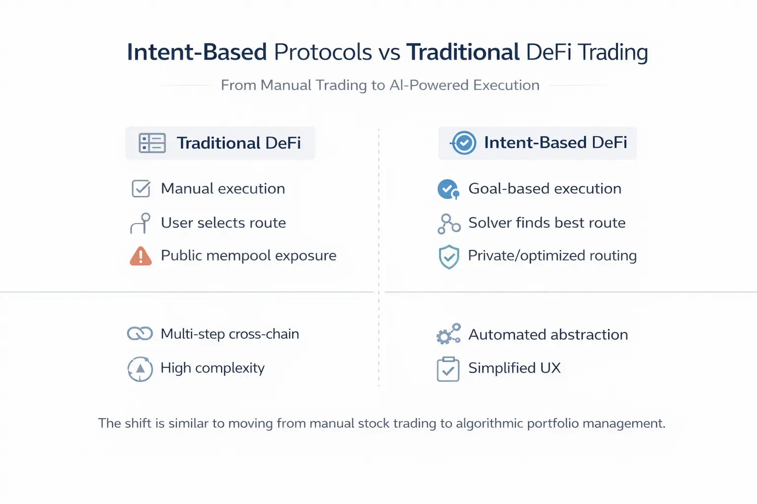 What Are Intent-Based Protocols in DeFi?Intent-based protocols represent a shift from imperative execution to declarative outcomes. In traditional DeFi: