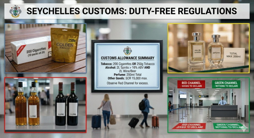 What are the duty-free rules for passengers arriving in Seychelles with an eTA?Customs regulations in Seychelles are strictly enforced. To avoid fines or confiscation at the "Red Channel," observe these limits per adult (18+): ![]()