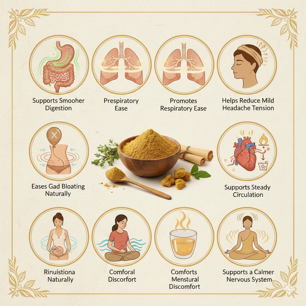 Understanding the Ayurvedic Position of AsafoetidaAsafoetida comes from the dried resin of the Ferula plant. Once powdered, it becomes the familiar hing used in kitchens and healing rituals across many regions. Ayurveda classifies it as warming and grounding, helpful in balancing Vata and Kapha while supporting digestive fire. Its presence in ancient formulations shows how deeply trusted it has been for centuries. Key Ayurvedic Benefits of Asafoetida (Hing Powder)Supports Smoother DigestionDigestive comfort is one of the strongest qualities associated with hing. The spice encourages the body to manage food breakdown more easily by supporting enzyme activity and easing intestinal tightness. For many generations, a tiny pinch added to lentils and beans has brought relief from heaviness after meals. Eases Gas and Bloating NaturallyAyurvedic texts praise hing as a valuable ingredient for reducing gas formation. By assisting the natural movement of air through the digestive tract, it helps ease bloating and abdominal pressure. A warm water mix with a small pinch of asafoetida remains a common household solution for sudden discomfort. Promotes Respiratory EaseThe warming quality of hing supports clearer respiration. It helps loosen stubborn mucus and encourages easier breathing, especially during seasonal changes. Traditional combinations of hing with honey or warm water are commonly used to maintain a clearer breathing pathway. Supports Steady CirculationAsafoetida contains compounds that help the body maintain smooth blood flow. This warming influence supports natural warmth, energy stability, and overall circulatory balance—especially valued during cooler months. Assists Natural Detox ActivityAyurveda highlights asafoetida for its ability to support digestive fire. When metabolic activity stays steady, toxin buildup is less likely to occur. Hing indirectly supports the body’s natural cleansing process by assisting smooth elimination and consistent metabolism. Comforts Menstrual DiscomfortHing is widely used in Ayurvedic routines that support menstrual ease. Its soothing influence helps relax abdominal muscles and ease monthly discomfort. A small amount added to meals or mixed with warm water can bring noticeable comfort. Helps Reduce Mild Headache TensionTraditional households often rely on hing for headaches linked to digestion or gas buildup. A simple paste made from hing and warm water applied to the forehead offers soothing relief and helps lighten heaviness. Supports a Calmer Nervous SystemAyurvedic teachings describe asafoetida as grounding. Its influence on calming Vata assists in maintaining steadiness in the mind and body. Cooking regularly with a small pinch of hing helps encourage a more relaxed state throughout the day.