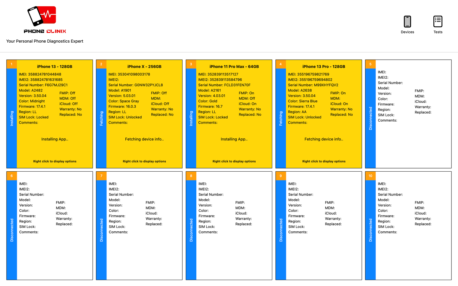 Easy Integration With Existing SystemsBusinesses should be able to export data easily and integrate it with ERP systems, inventory software, or resale marketplaces. Top Diagnostic Software for Bulk Phone TestingHere are some of the most reliable and widely used tools for testing large batches of mobile phones: Phone ClinixPhone Clinix is one of the most advanced and user-friendly phone diagnostic software solutions available today. It’s tailored for businesses that process high volumes of devices and need accuracy, automation, and simplified workflows. Key Features of Phone Clinix